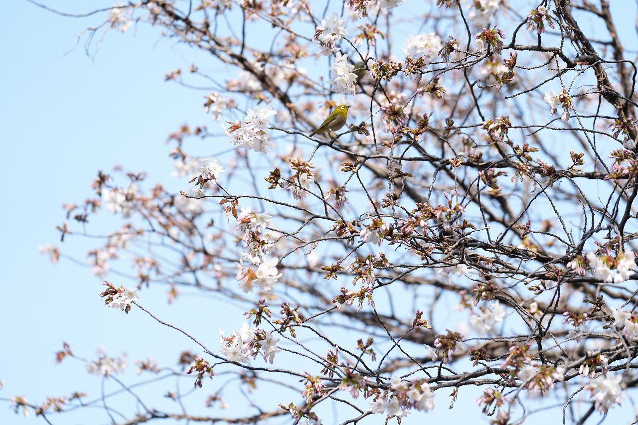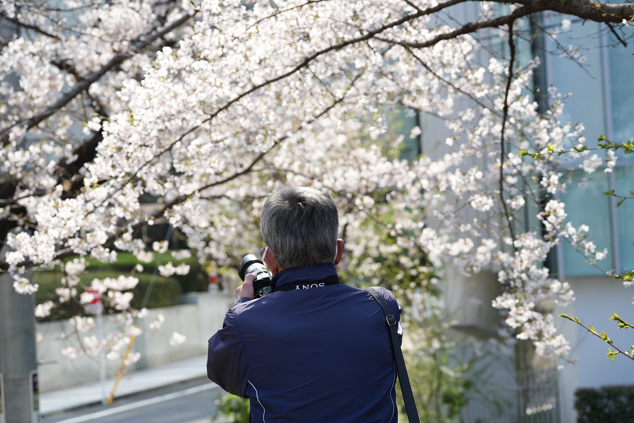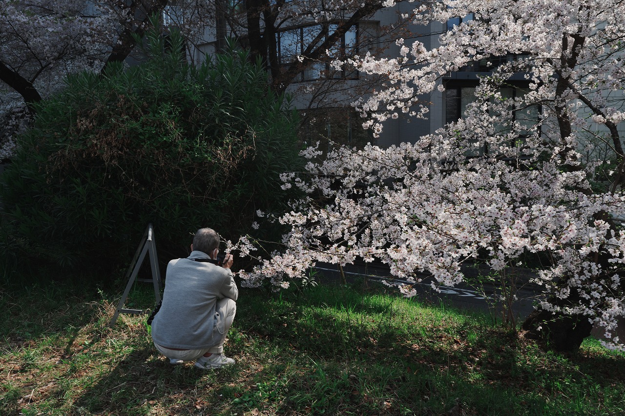 静寂のオフィスビルや大学を背景に都会の桜の撮影が楽しめました
